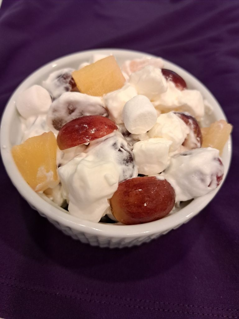 Christmas Salad or Grape Salad has been served at almost every Thanksgiving and Christmas dinner that I can remember growing up. I have no knowledge where the recipe originated. This salad is actually more of a dessert and is very simple, using only 4 main ingredients: seedless red grapes, pineapple tidbits, mini marshmallows and whipped cream (the real stuff only). A fond memory is that during the 2+ hour road trips to go to family holiday dinners, mom would sit in the car, working to halve and deseed the grapes for this salad as there were no seedless grapes available back in the 1960’s. What a mess, but it had to be done so the grapes and pineapple could sufficiently drain. The heavy cream would be whipped and sweetened at the last minute, just before serving to ensure that it was as fresh as possible. Any remaining Grape Salad was highly coveted to accompany the obligatory turkey sandwich and other leftovers later in the day. I hope you and your family enjoy this simple recipe, whether you decide to eat it as a salad or a dessert.